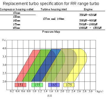 | The replacement turbo is for RR-131, RR151, RR181, RR221, MTU 396 and TPS serials, etc. The RR, MTU & TPS serials replacement turbo is a lightweight, low-cost turbocharger of robust design, offering high efficiency, high gas-inlet temperature capability and good compressor characteristics. The RR & TPS replacement turbo is designed for an output range of about 500 kW to 1,800 kW and gas engines in the 500 kW to 3,300 kW power range.