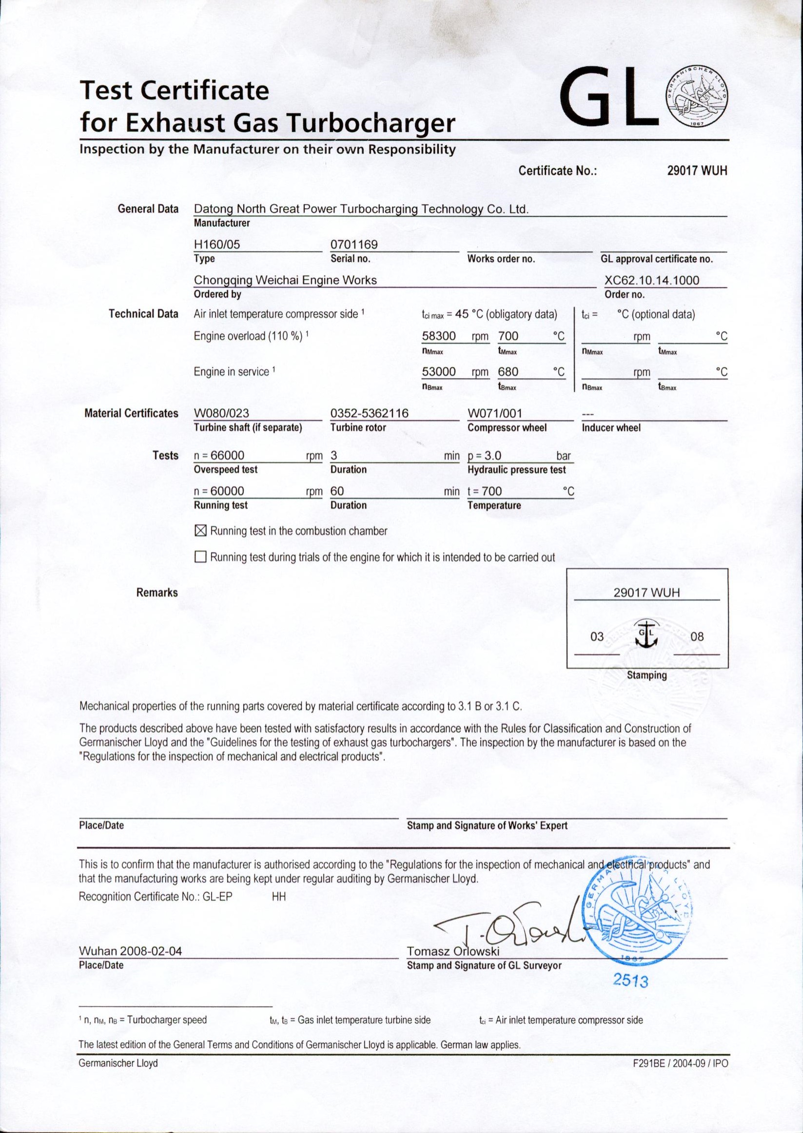 1. Test Certificate for Exhaust Gas Turbocharger by GL.