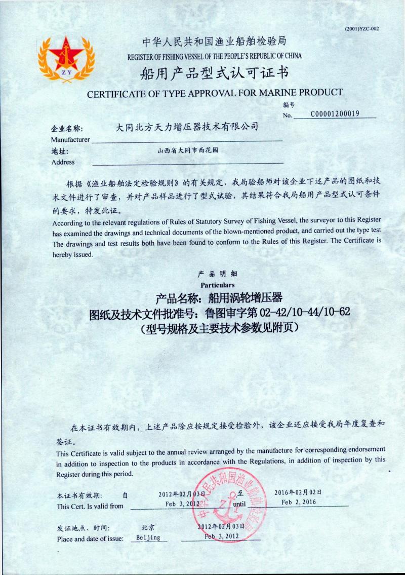 5. Certificate of Type Approval for Marine Turbo by the Register of Fishing Vessel of PRC.